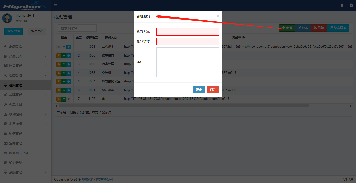 進入思普云,點擊【視頻管理】,點擊【新增】,視頻名稱自定義填寫,將螢石開放平臺上復(fù)制的鏈接粘貼到視頻鏈接,點擊確定,
