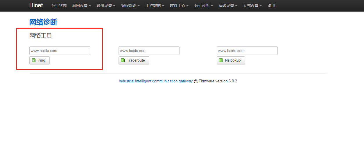 2.PLC的IP是否錯誤,進(jìn)網(wǎng)關(guān)后臺,點(diǎn)擊“分析診斷 - 網(wǎng)絡(luò)診斷”,輸入PLC的IP點(diǎn)擊【ping】,如果網(wǎng)關(guān)LAN口IP與PLC的IP在同網(wǎng)段,而此處ping不通PLC的IP,則PLC的IP錯誤,請確認(rèn)PLC的IP并修改。