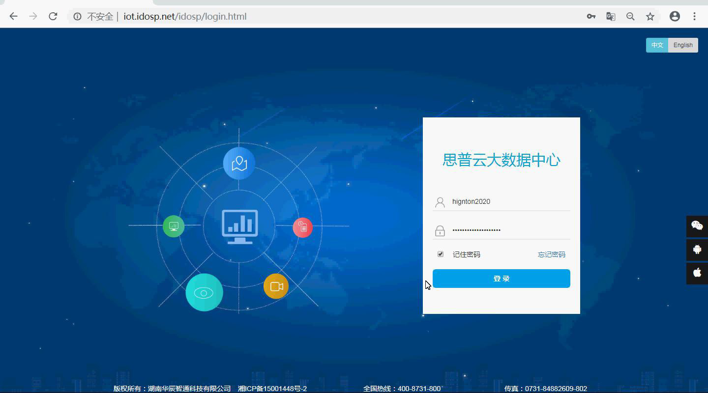 瀏覽器輸入iot.idosp.net 進入思普云登錄界面,輸入賬號密碼進入平臺管理界面。